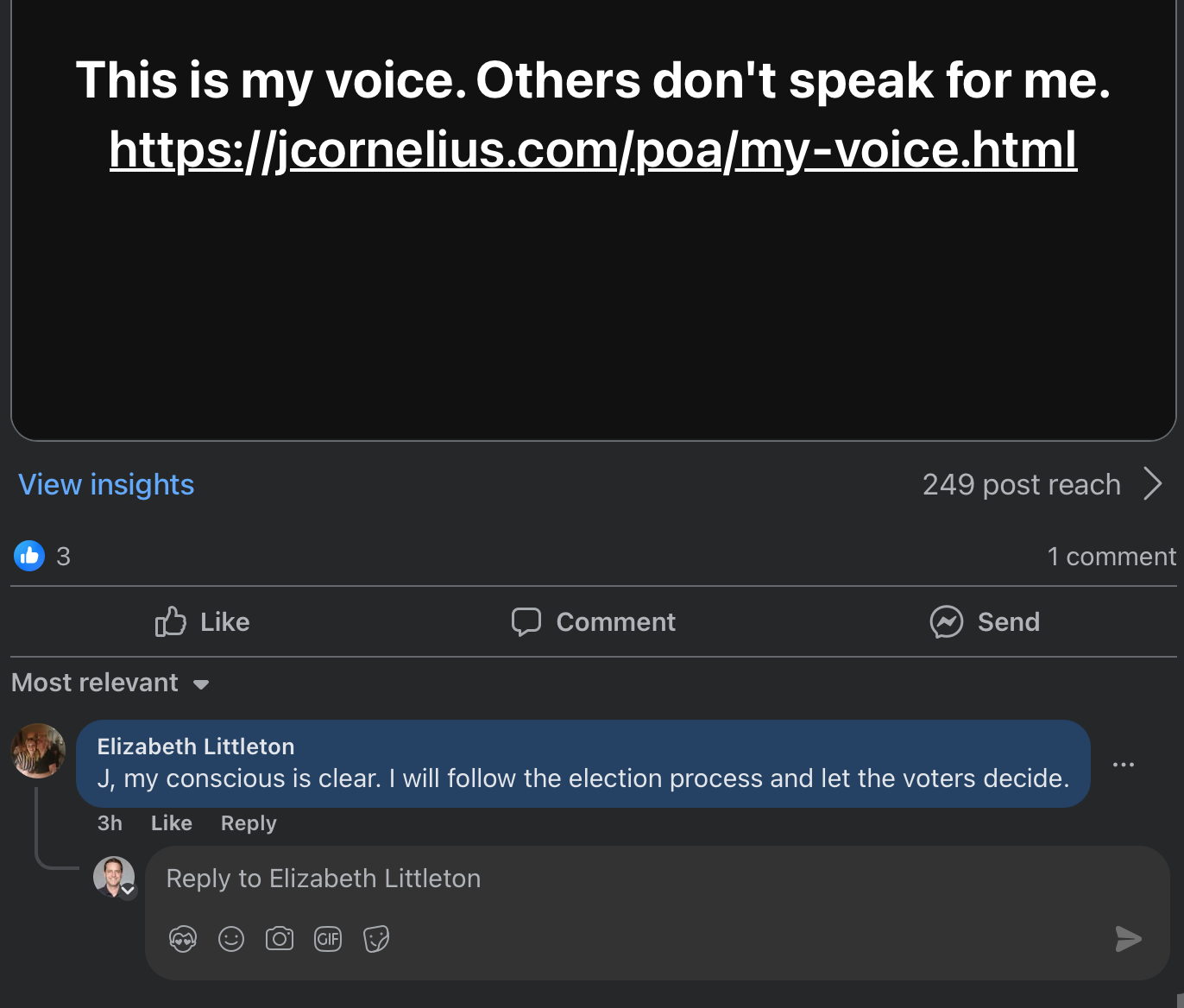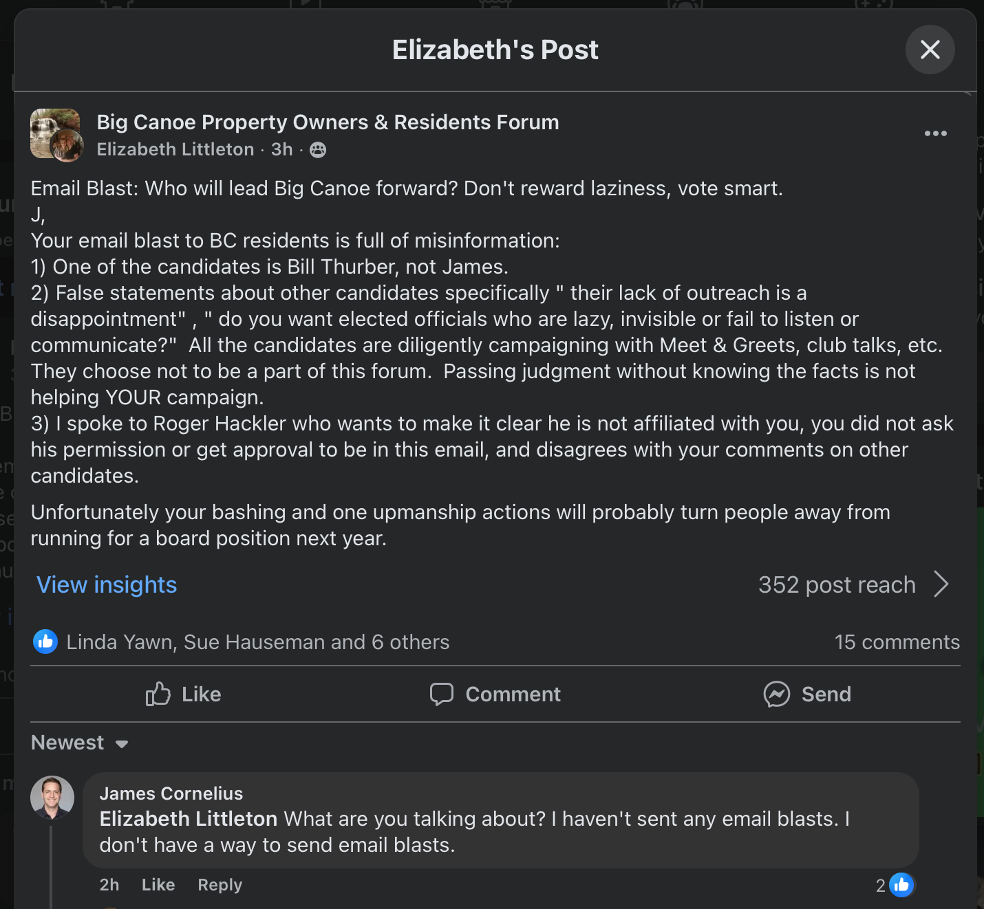 I write to you today not out of anger, but out of concern. Recently, the Chair of the Election Committee, Elizabeth Littleton, posted online accusing me of sending an email filled with “false statements” about other candidates. She offered no proof, and when asked, she provided none.